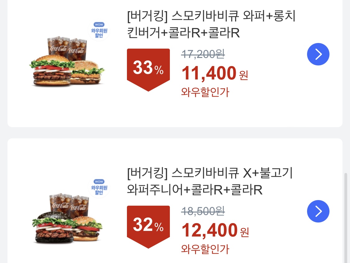 - [33% 할인] 스모키바비큐 와퍼 + 롱치킨버거 + 콜라 R 2개