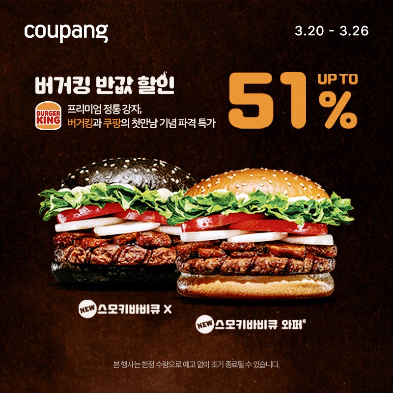 3월 20일부터 3월 26일까지 단 7일간 버거킹 반값할인 특가가 진행됩니다!