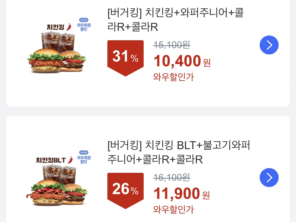 - [26% 할인] 치킨킹 BLT + 불고기와퍼주니어 + 콜라 R 2개